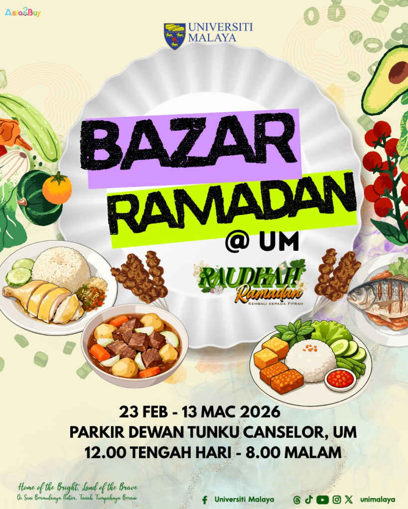 Warga kampus dan pengunjung sekalian! Bazar Ramadan @UM akhirnya akan beroperasi dari 23 Feb-13 Mac 2026 bertempat di Parkir Hadapan DTC, UM! 🎉